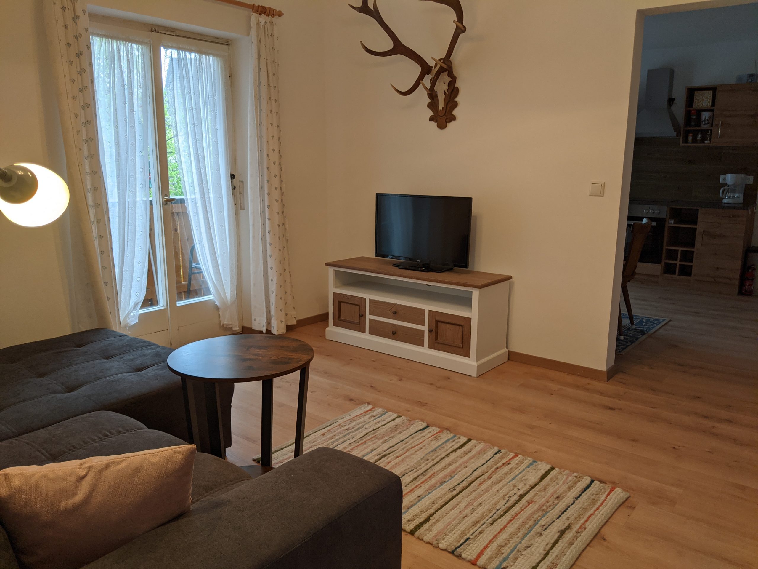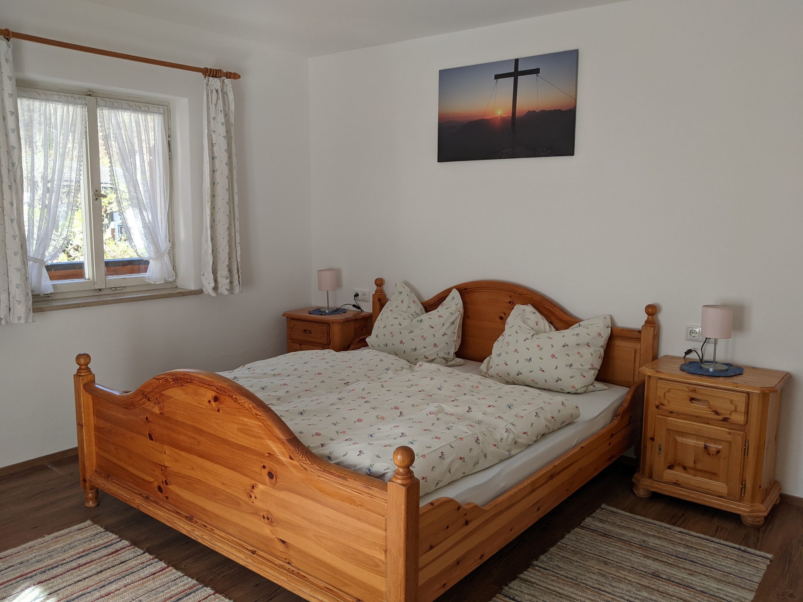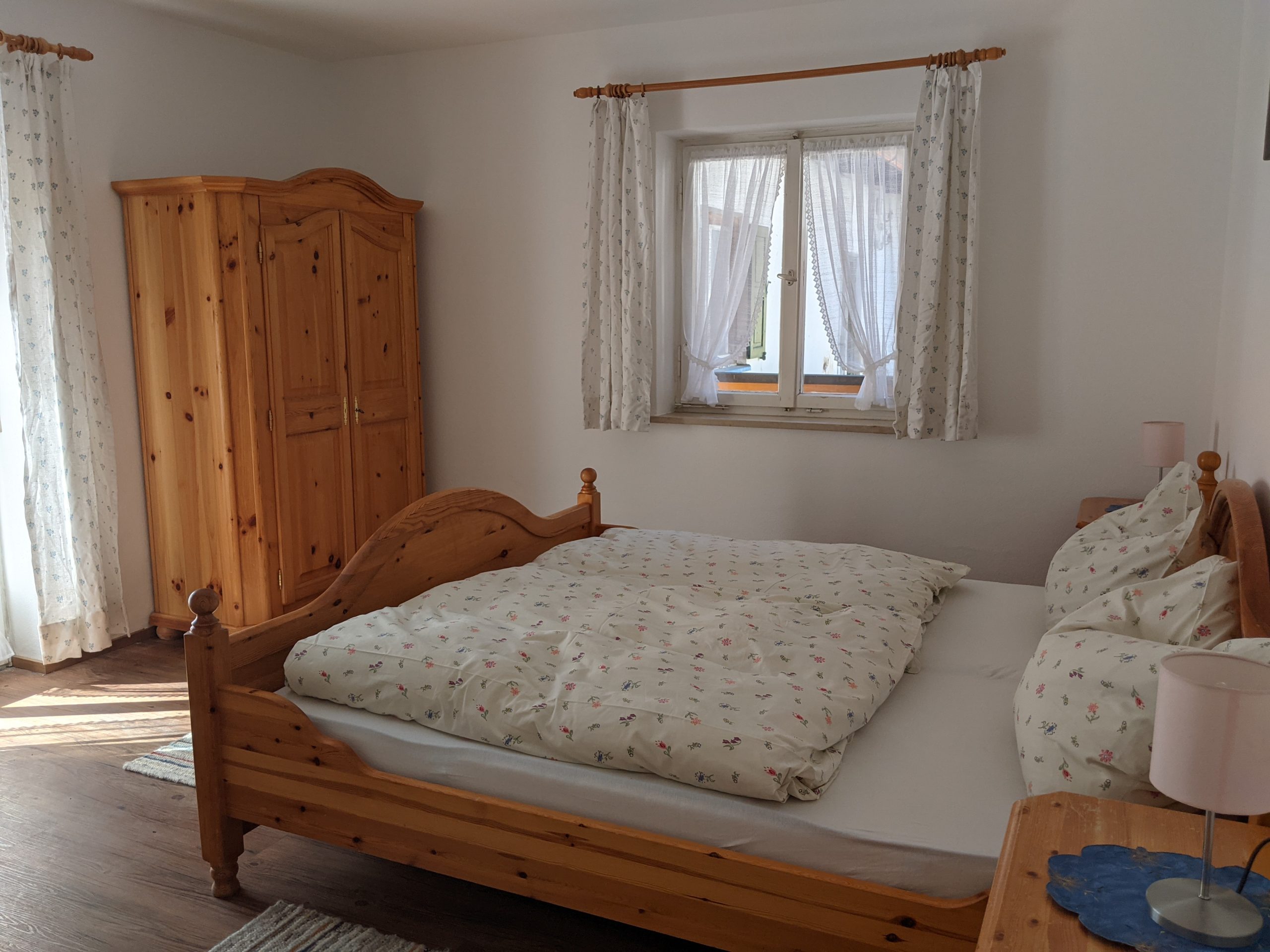 Unsere große Ferienwohnung im 1. Stock ist hervorragend geeignet für Paare oder Familien. Mit einem Schlafzimmer (Doppelbett), Wohnzimmer (Schlafcouch), Küche, Bad (Dusche), WC haben Sie auf 60 m2 Platz für bis zu vier Personen. Vom umlaufenden Balkon aus haben Sie einen wunderbaren Blick auf das Karwendelgebirge.